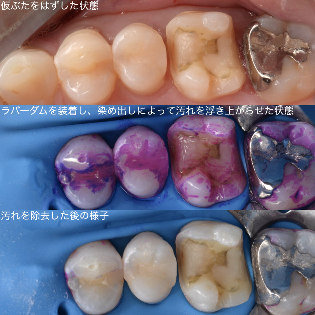 上図のように仮蓋を外した直後の画像は一見すると綺麗ではありますが、このように染めだすと汚染されていることがわかります。エアフローという特殊な器具で徹底的に汚れを取り払います。