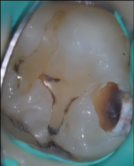 まずは虫歯検知液を使用して、虫歯に侵された部分(軟化象牙質)を染色します。