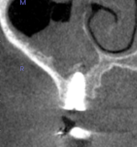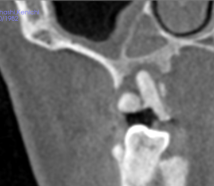 このケースでは上顎洞の手術をする際にリスクとなる、後上歯槽動脈の位置と隔壁や上顎洞の形態的にサイナスリフトが非常に困難な状況でした。合わせて、患者様の希望により可能な限り治療期間を短くしてほしいとのことも踏まえてソケットリフトによる抜歯即時インプラント埋入術を行いました。