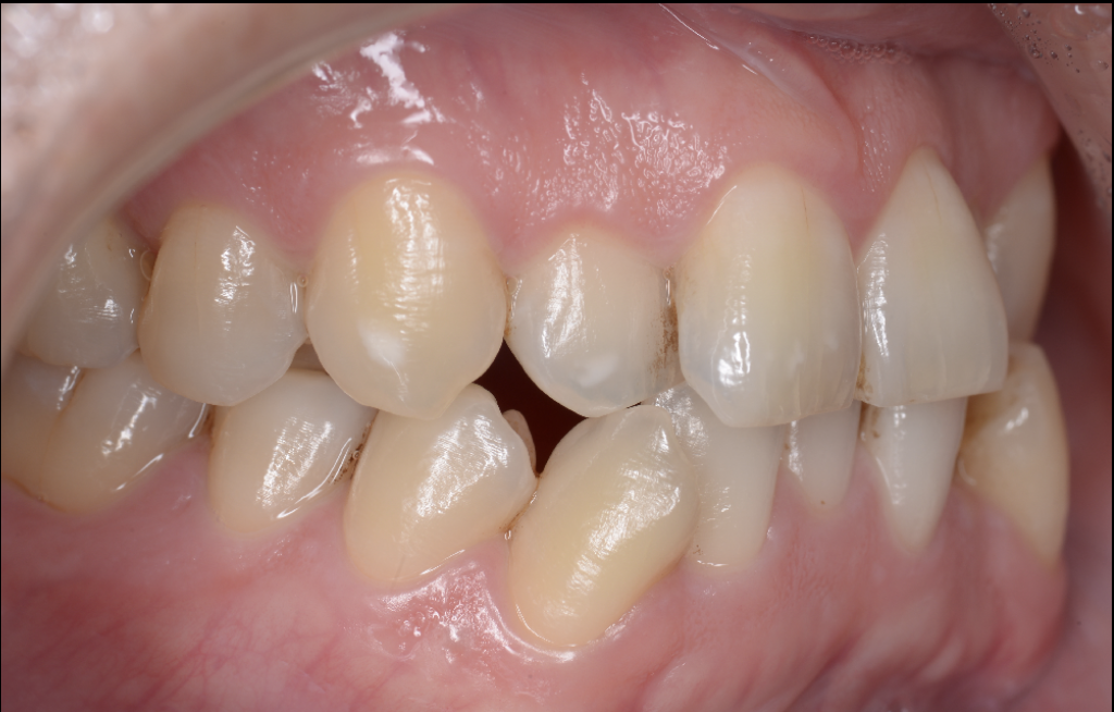 上顎の叢生(歯のガタガタ)と下顎の左側へのズレを認める