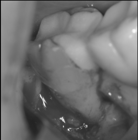 フラップを起こすと不良肉芽と根面に歯石を認めた。