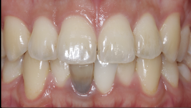 以前の矯正治療による偶発症として失活してしまい歯髄の狭窄があったため、保存は難しかったですが、患者様の強い希望によりマイクロスコープにて詰まった閉塞した根管を探索し、根管治療を行うことができました。