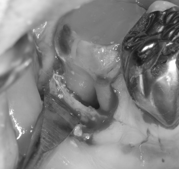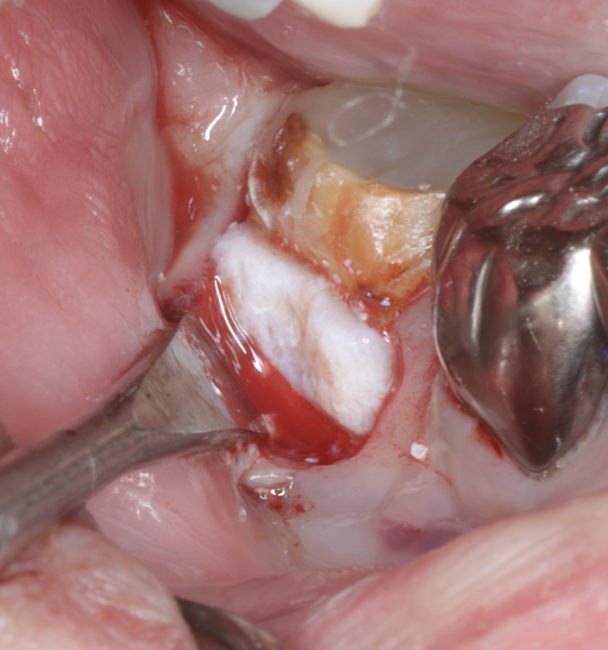 骨支持の喪失が見られましたが、根面・感染範囲を精査し、再生療法の適応と判断しました。
