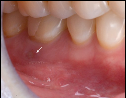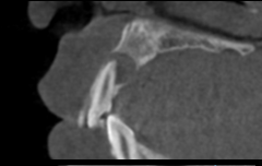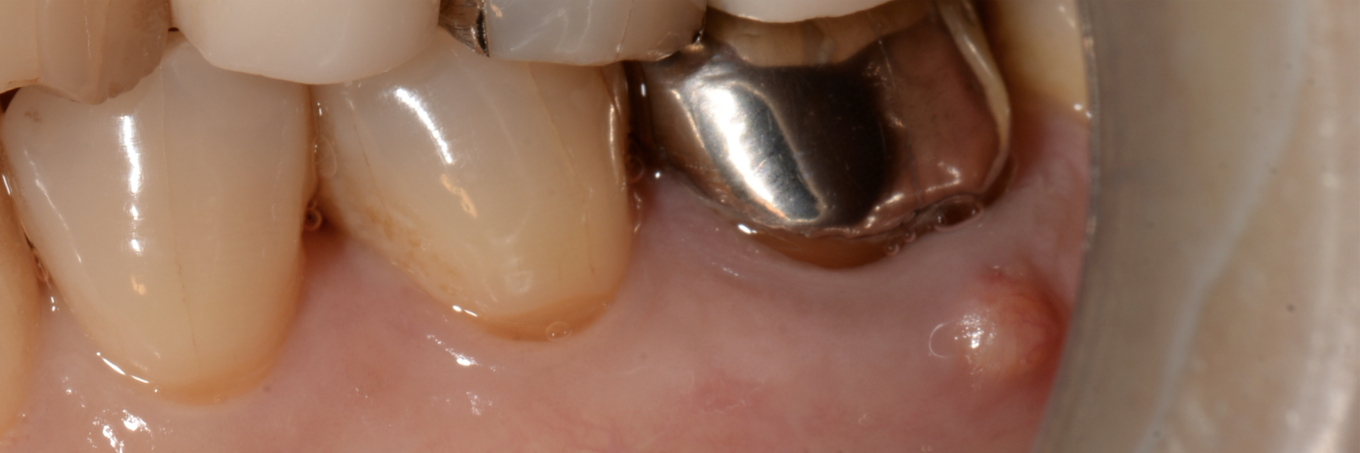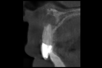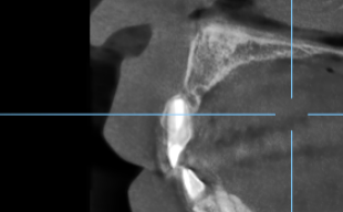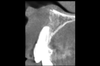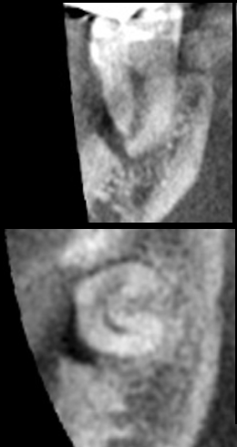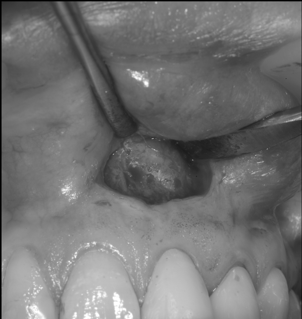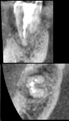 上唇の腫脹を認め、CT検査にて根尖部に嚢胞様透過像を認めた。左上の前歯が不自然に大きく噛み合わせが強くなっていたことがフレアアップの一因と考える。精密根管治療を行い、感染経路を遮断したのち歯根端切除術にて嚢胞を摘出した。