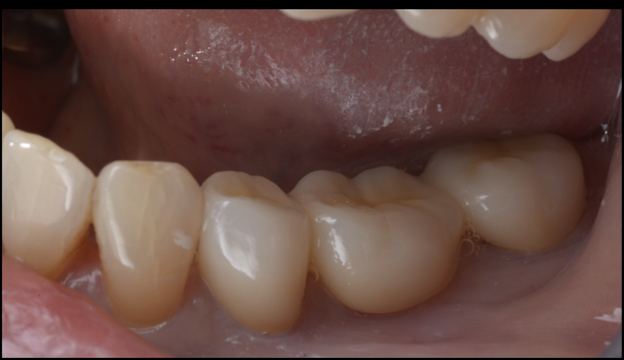 | 治療内容 | 極度の歯科恐怖症で、無痛リラクゼーション治療を希望。 1ヶ月後にカナダに帰るとのことより、それまでに治療を終えてほしい。 左下奥歯は破折を認め、保存が困難な状況であった。他にも治療途中の歯があり、左奥歯がなくなると食事に困るとのことよりブリッジ治療を選択。 本来であれば、抜歯後5ヶ月ぐらいは待つが歯周組織の変化をコントロールするためにソケットプリザベーションと歯肉縁下形成を併用し、即日印象、プロビジョナルレストレーションを調整し、次回アポイント時セットを行なった。 |