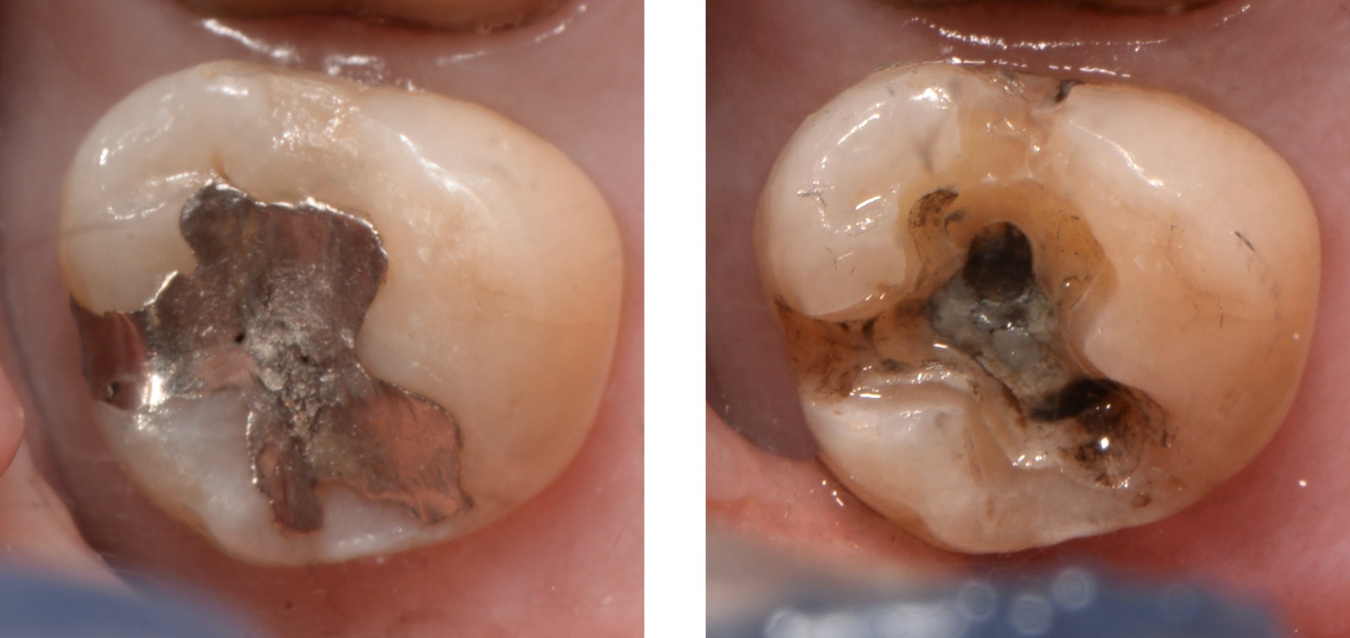 上記左側の写真のように、一見封鎖性のよい詰め物に見えたとしても、右側写真のように歯科用顕微鏡(マイクロスコープ)を用いた拡大写真を見ると、隙間にプラークが入り込んでいることがわかるかと思います。