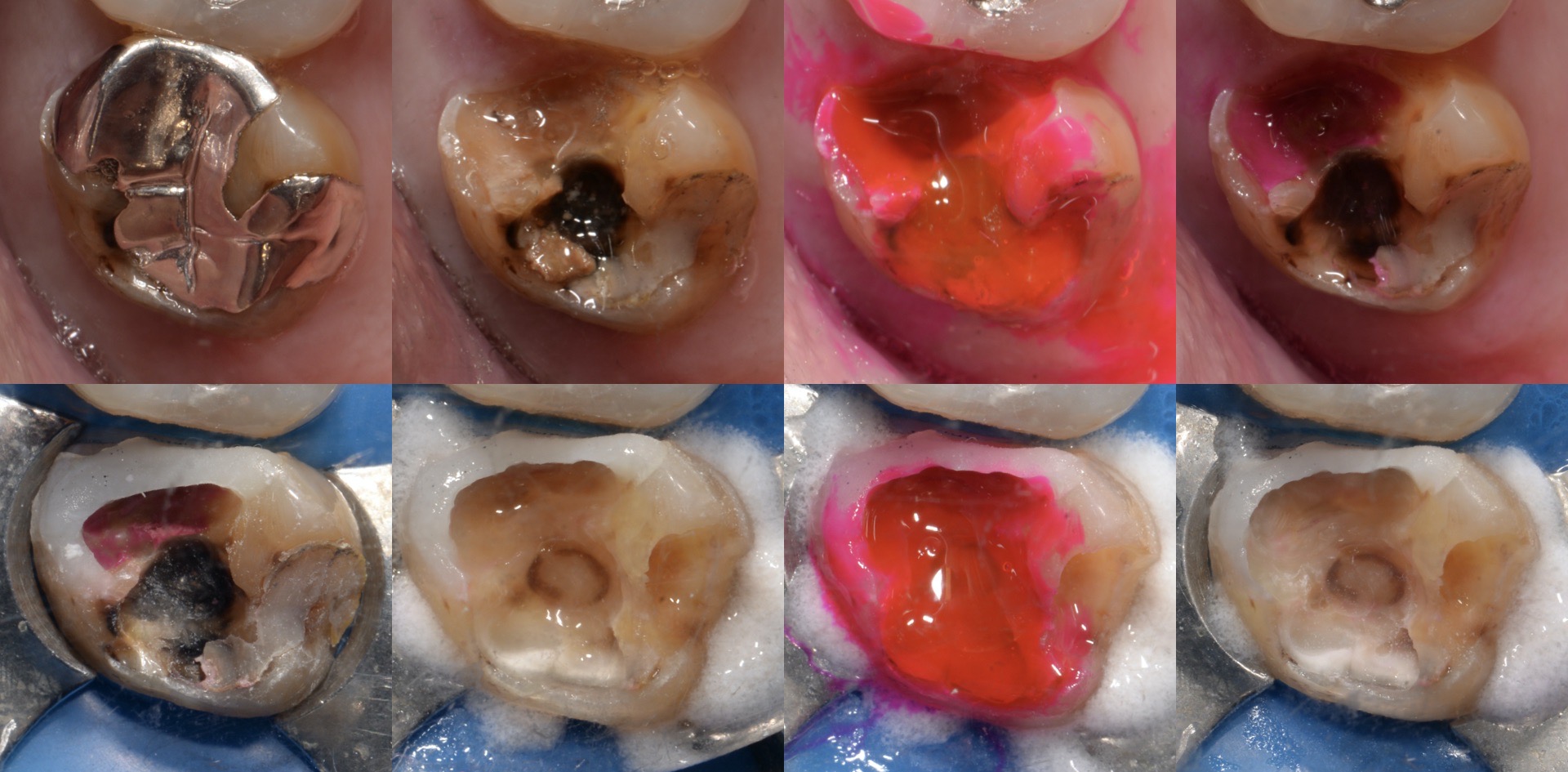 当院では闇雲に削らないように、歯科用顕微鏡(マイクロスコープ)を使用しカリエスチェッカー(虫歯の検査薬)を用いて虫歯だけを染め出し、何度も何度も繰り返し、染まっているところのみを削っていきます。